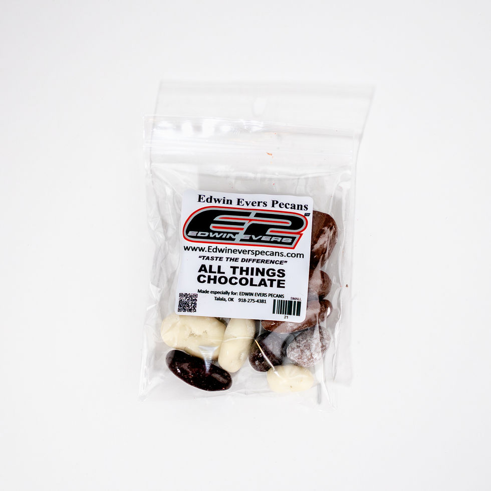 Can’t decide which chocolate flavor you want? This is the one for you! A sample of all of our chocolate pecans. Milk Chocolate, Dark Chocolate, White Chocolate and Chocolate Toffee.