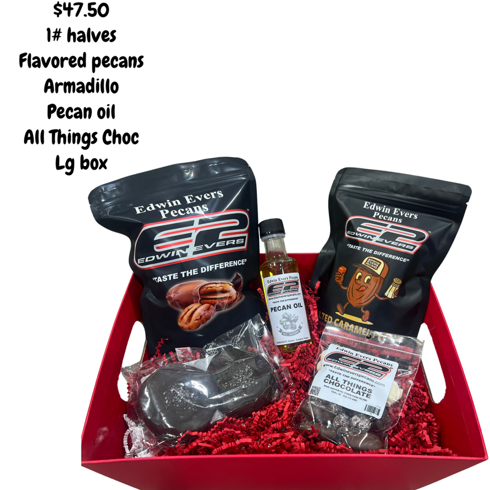This large gift box includes a bag of "All Things Chocolate", 1 pound pecan halves, a bag of candied pecans, armadillo, and pecan oil. Request your candied pecan flavor.